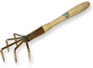 Kleiner handlicher Rechen zum Lockern und Anebnen. Massive Kupferlegierung, Griff aus Buchenholz.